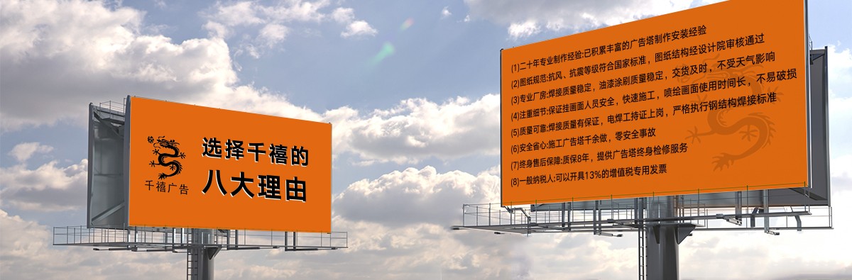 世紀(jì)之交,石家莊千禧廣告裝飾有限公司(下方簡(jiǎn)稱千禧廣告公司或公司)自2000年10月10日創(chuàng)立伊始,即在燕趙大地落地生根,成長為國內(nèi)擁有23年施工經(jīng)驗(yàn)的實(shí)體型戶外廣告設(shè)施制作工廠。公司集新品研發(fā)、結(jié)構(gòu)設(shè)計(jì)、生產(chǎn)制作、施工建造于一體,現(xiàn)代化生產(chǎn)廠房為大中型高炮廣告牌(又稱高炮廣告塔、單立柱廣告牌、單立柱廣告塔、擎天柱廣告塔、擎天柱廣告牌)、龍門架、三面翻鋼結(jié)構(gòu)、LED廣告屏鋼結(jié)構(gòu)等的精益生產(chǎn)、高效流水化作業(yè),產(chǎn)品交工質(zhì)量過硬,公司擁有現(xiàn)代化生產(chǎn)車間,配備了不可或缺的硬件裝備。